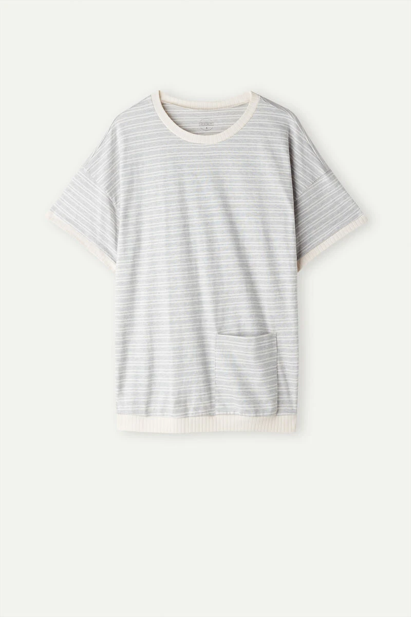 Striped cotton jersey top with round neck and short sleeves. Contrasting ribbed trim. Casual style. Regular fit.