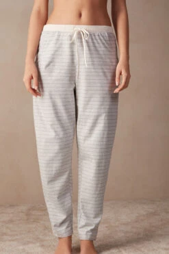 Striped cotton jersey trousers. Drawstring waist and contrasting-colour ribbed trim. Casual style. Regular fit carrot silhouette.