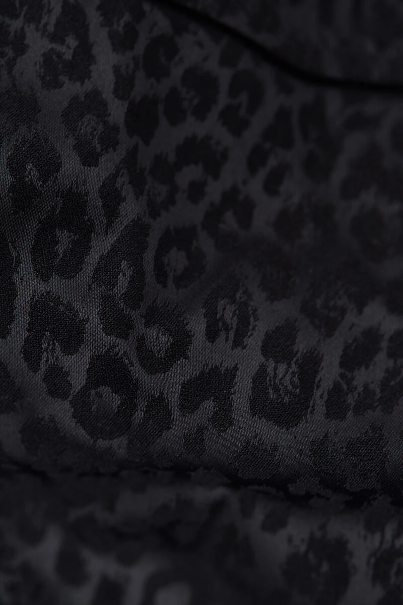 Bodysuit with unpadded non-wired triangle bra. It is made with animal-pattern jacquard satin and with a soft tulle to create a sensual transparent effect. It features square jewel accessories. The double shoulder straps are made of satin and are adjustable at the back. 100% cotton gusset with press-stud closure.