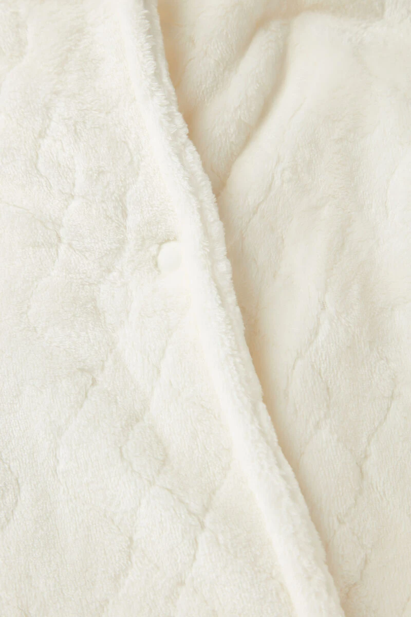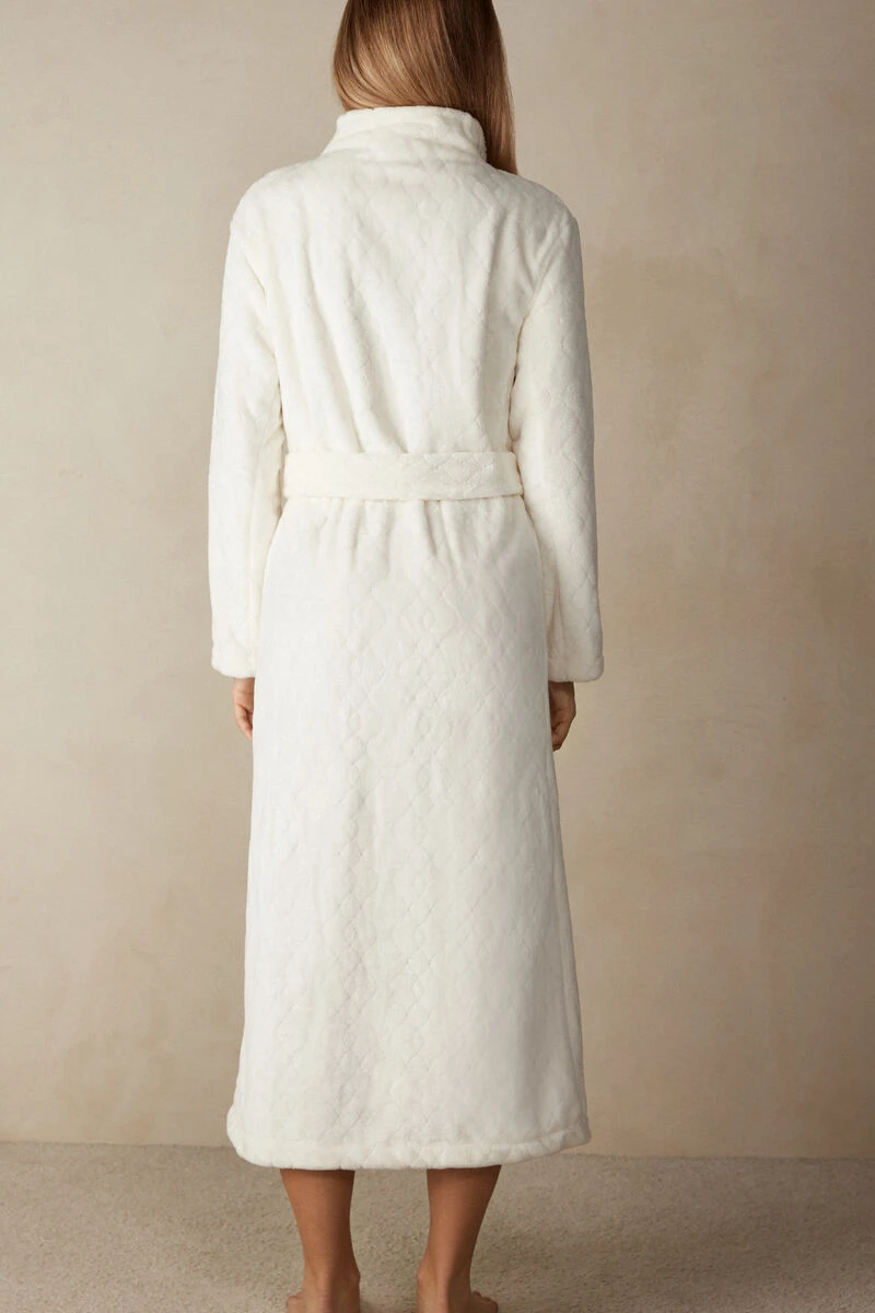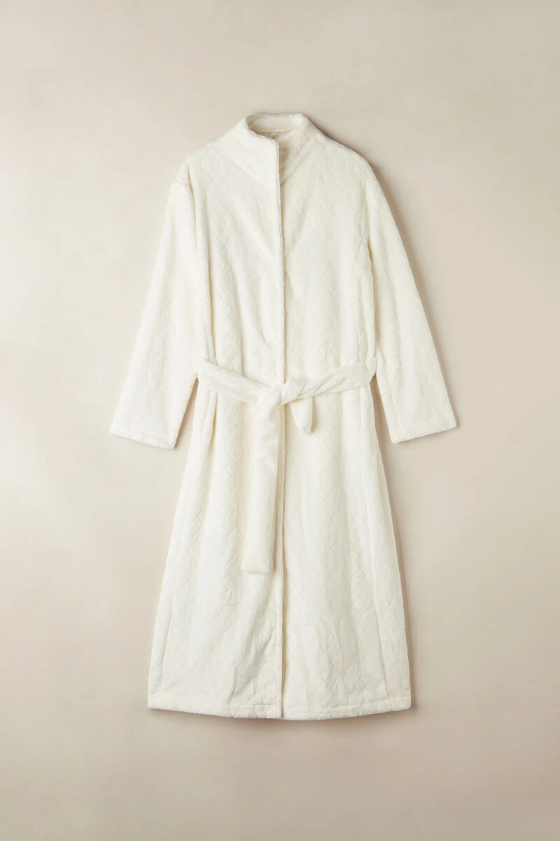 Long dressing gown in soft, snow-white jacquard fleece with high neck and press studs. Belt and side pockets.