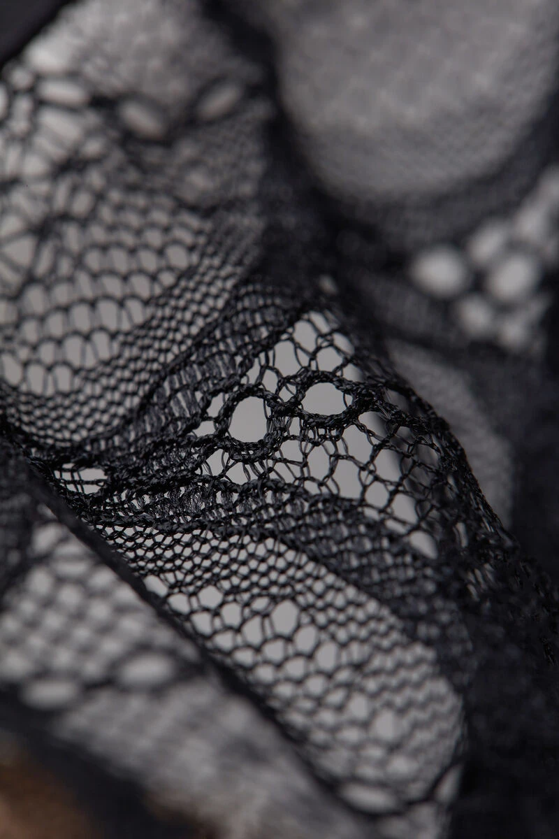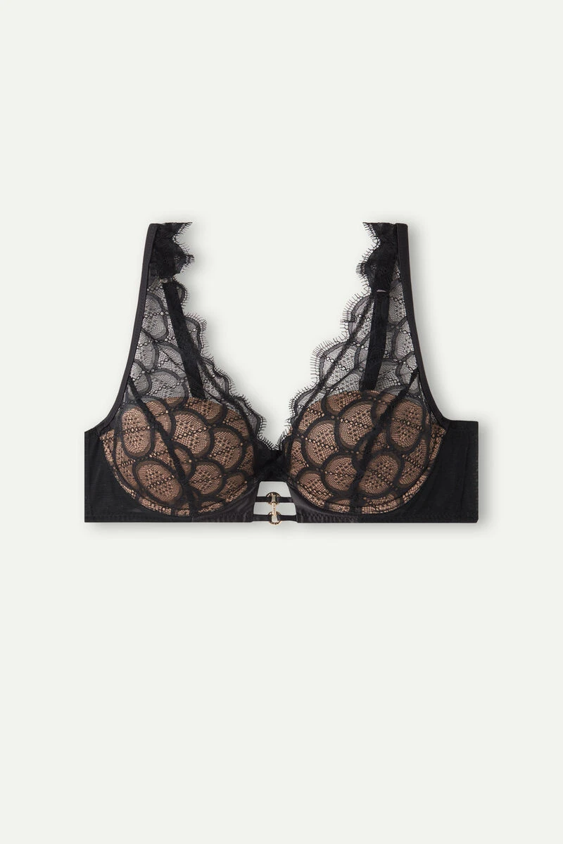Elena balconette bra with underwire and semi-padded cups for soft support and a natural effect. It is made with an elegant and sensual geometric pattern lace featuring a soft eyelash effect on the scallop border. A golden accessory with small rhinestones embellishes the satin motifs in between the cups. Refined satin trim and underband made from soft plumetis tulle. The straps are adjustable at the back. The model changes cup and structure starting from cup 4 to provide enhanced comfort and support.