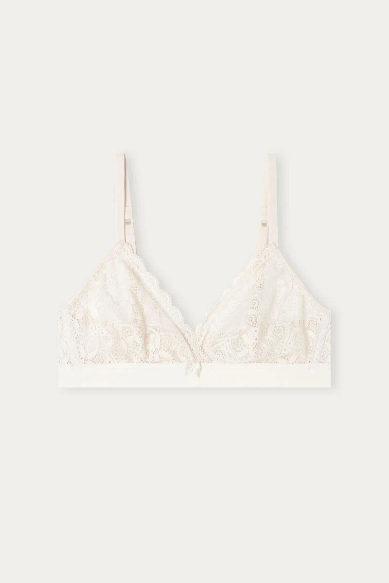Emma triangle bra with cups crafted entirely from lace, no underwire and no padding. The slightly slanted side boning softly contains the bust. The underbust is covered in microfibre and lightly supports the bust. The lace underband fastens with four sets of three hooks. The straps are covered in microfibre and are adjustable at the back. Crafted from soft, comfortable stretch lace detailed with a geometric design and romantic frills. Soft and lightweight bra, ideal if you’re looking for a glamorous style.