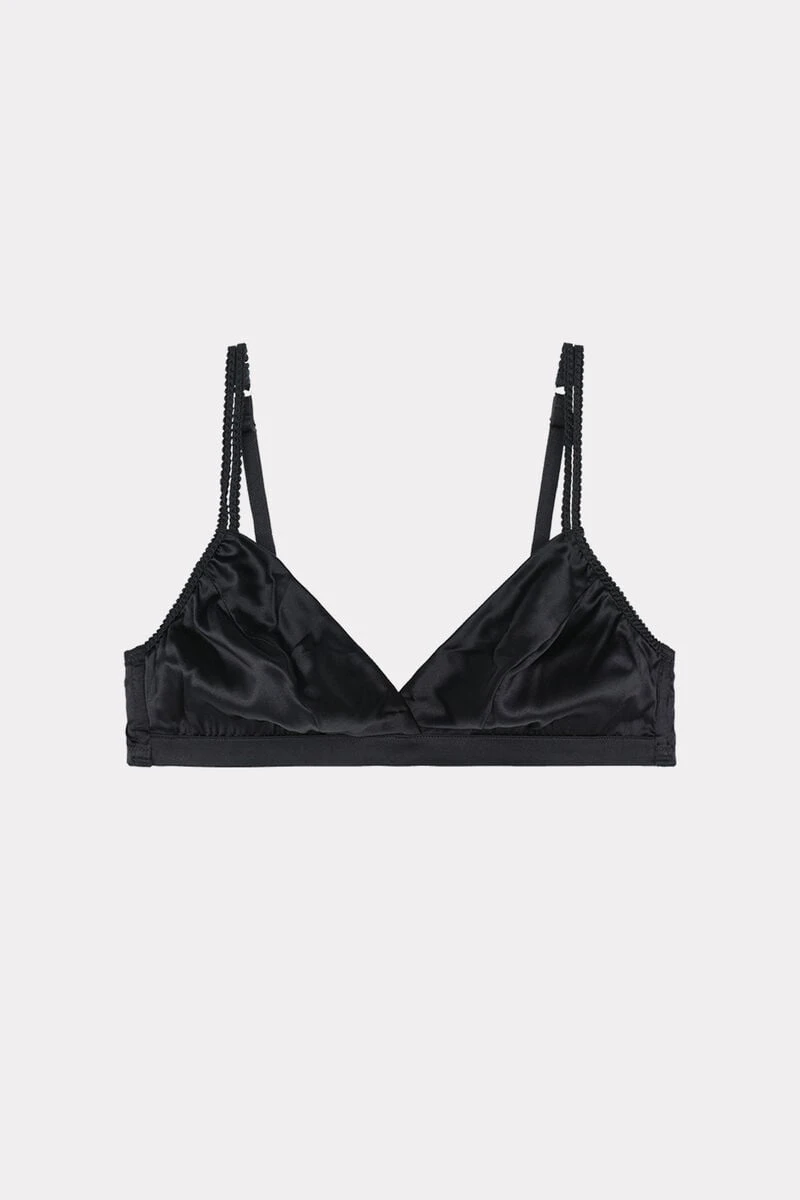 Emma unpadded wireless triangle bra styled in silk. Featuring elegant braided double shoulder straps and imperceptible stitching. The cups are fully lined, ensuring light support ideal for those after a simple and refined look. Adjustable back and straps.