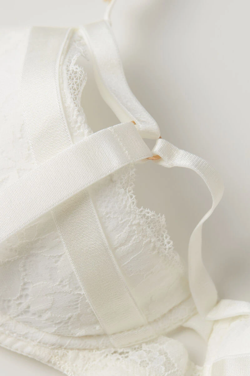 Carioca bra with slightly padded cups and underwire, crafted from stretch lace and soft tulle. Complete with sensual touches such as elastic tapes and small gold rings with logo detail. The elasticated straps are adjustable at the back. A very feminine bra that accentuates the décolletage.