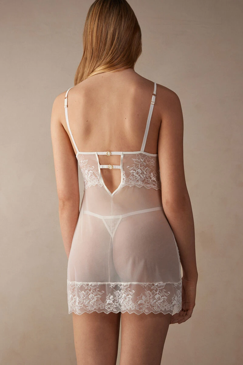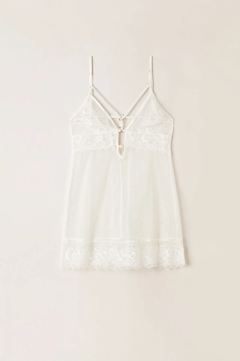 Babydoll with triangle cups, crafted from soft tulle and embellished with lace details. Complete with sensual elastic tapes and small gold rings with logo detail. The straps are adjustable at the back.