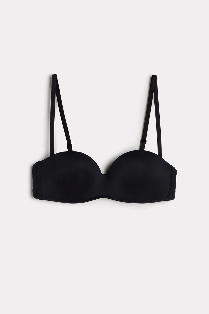 Gioia super-padded unwired bandeau bra in microfiber with removable straps and cotton-lined cups. The latest generation graduated super-soft padding is ideal for the woman who wants to enhance her cleavage with all the comfort of a bra with no rigid parts. Perfect with tube dresses.