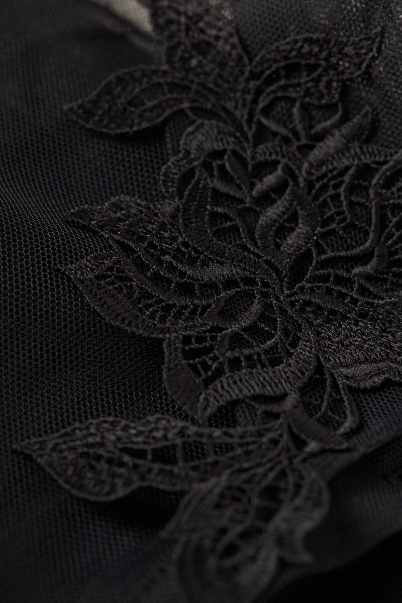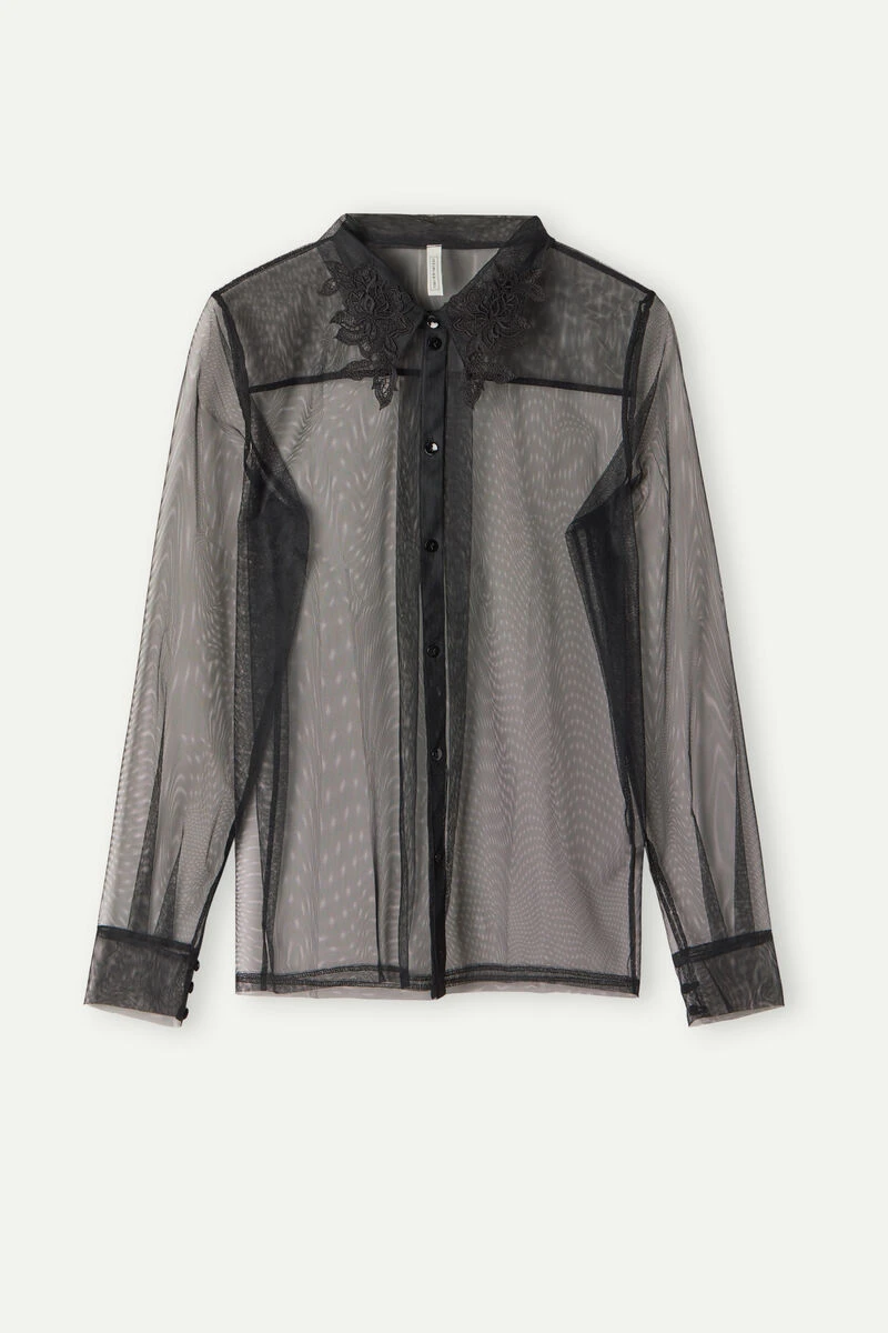 Tulle shirt with charming macramé appliqué on the collar. Cuffed sleeves and yoke with darts at the back. A feminine and sensual style to wear over a bra or a top. Regular fit.