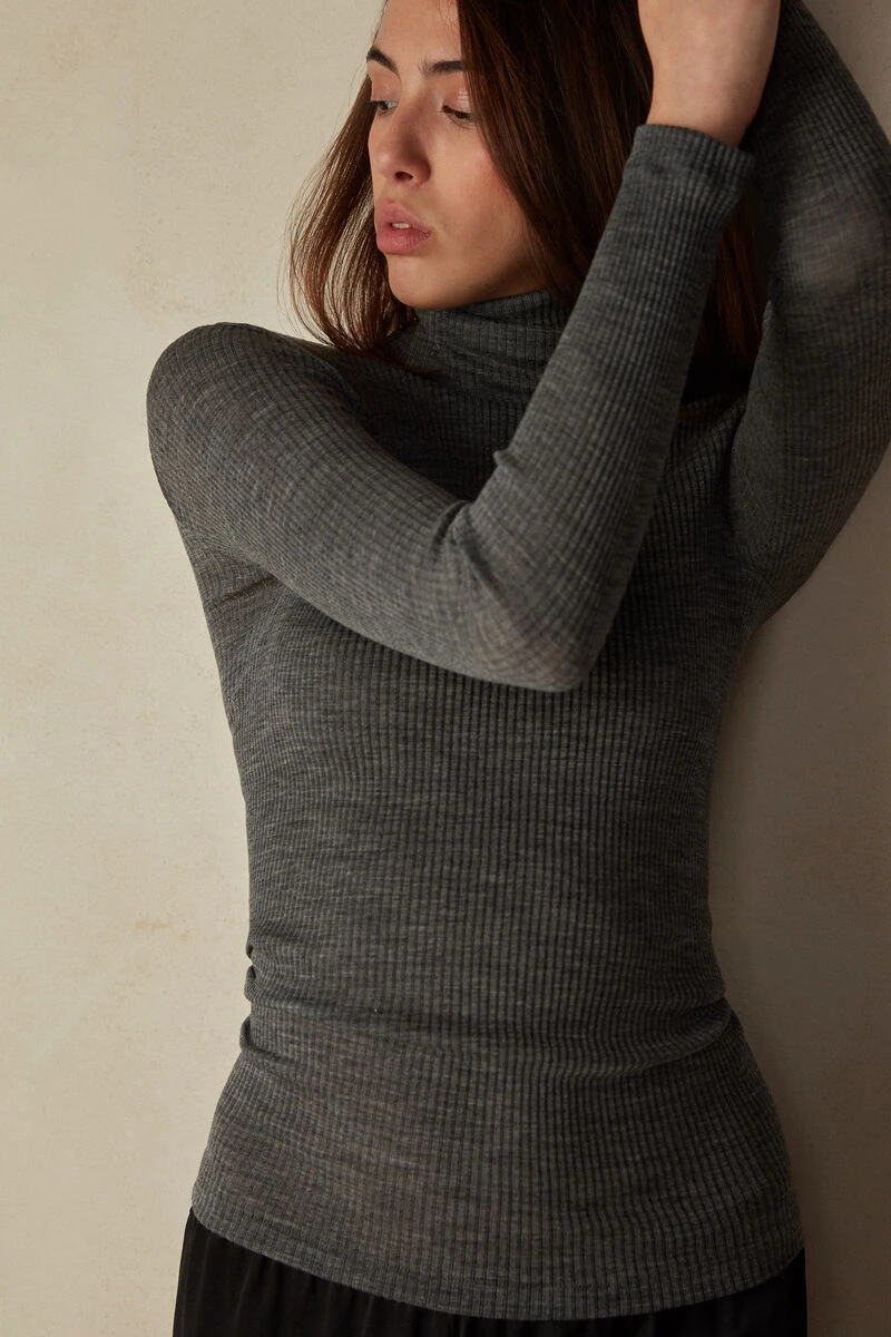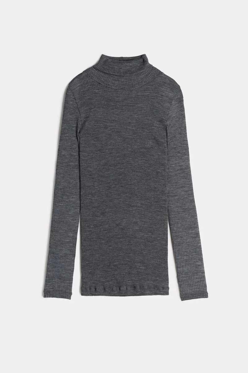 Long-sleeve high-neck tubular top made from a wool-silk blend.