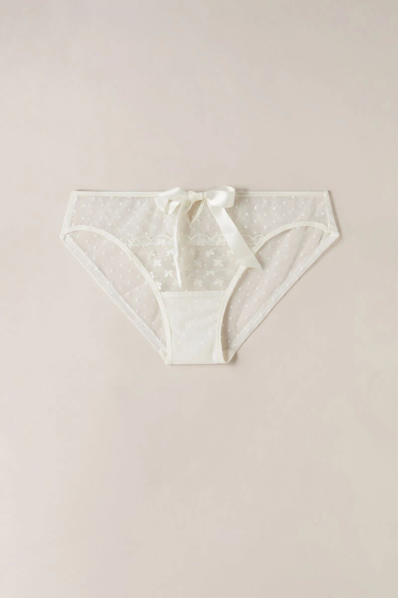 Soft stretch dotted mesh tulle panties with romantic bow-embroidered tulle trim. Embellished with an elegant satin trim and a charming removable satin bow. 100% cotton gusset.