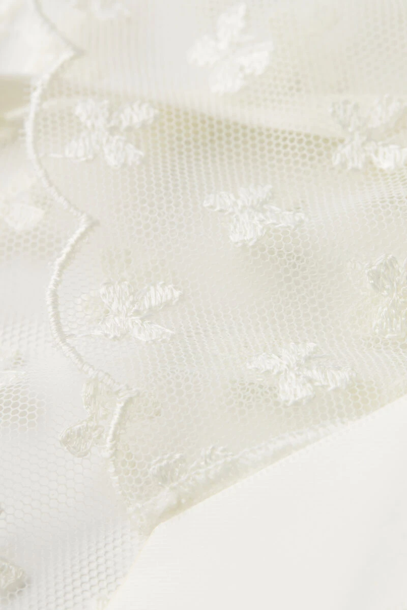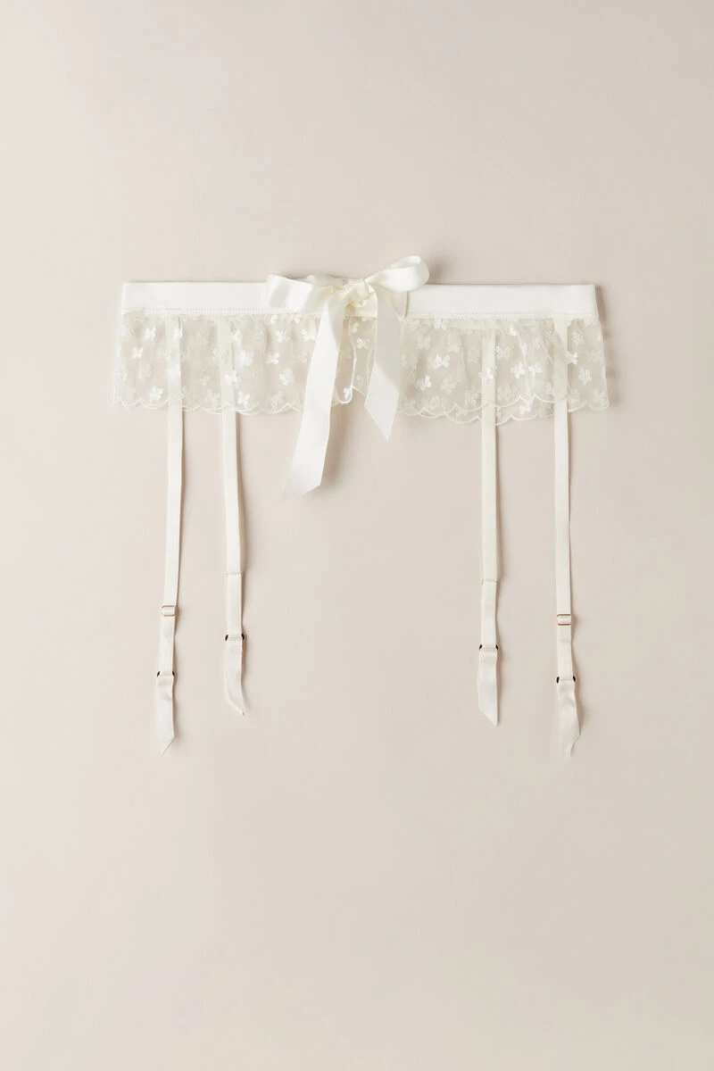 Suspenders made from romantic tulle with bow embroidery and satin waistband. A charming removable satin bow embellishes the back.