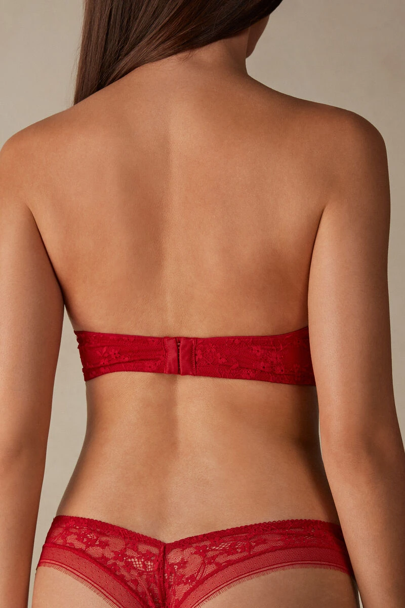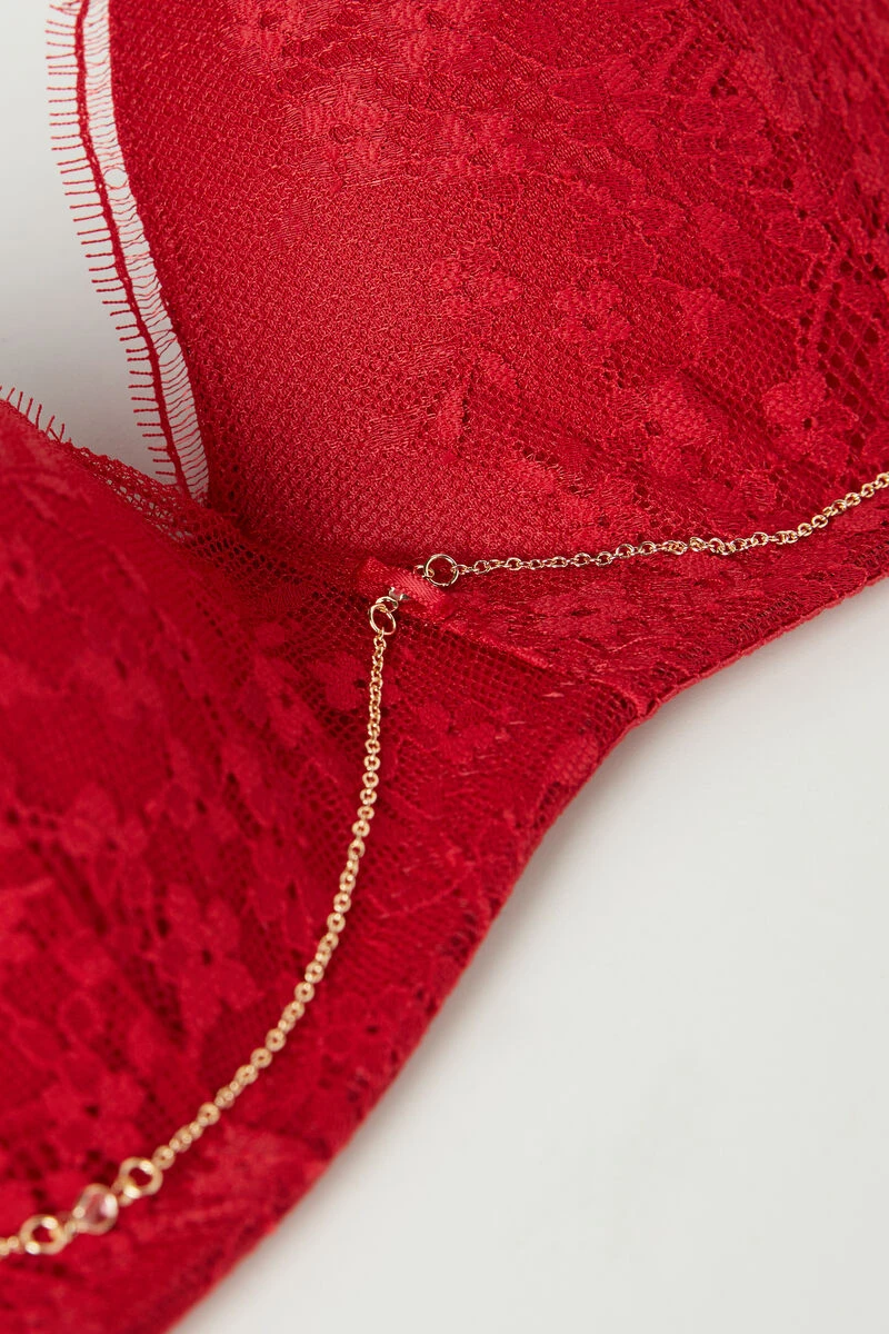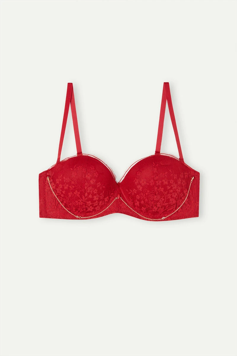 Gioia super-padded wireless bandeau bra. Crafted from sensual and feminine stretch lace made with a motif of mini flowers. The bra is embellished with a removable gold chain that can be adjusted using the eyelets on the front. Adjustable and removable elasticated straps. The very soft latest-generation graduated padding is ideal for anyone looking to enhance their décolletage by increasing the size of their bust, without sacrificing the comfort of a bra that has no rigid parts.