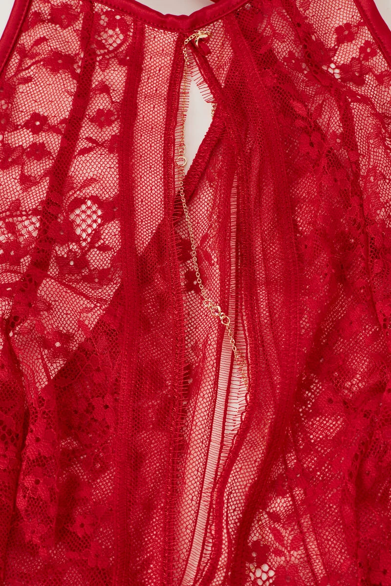 Body with triangle cups, crafted from stretch lace made with a motif of mini flowers and trimmed with satin. The fastenings on the front and back are embellished with a removable chain. The adjustable elasticated straps fasten around the neck. 100% cotton gusset with press-stud closure.