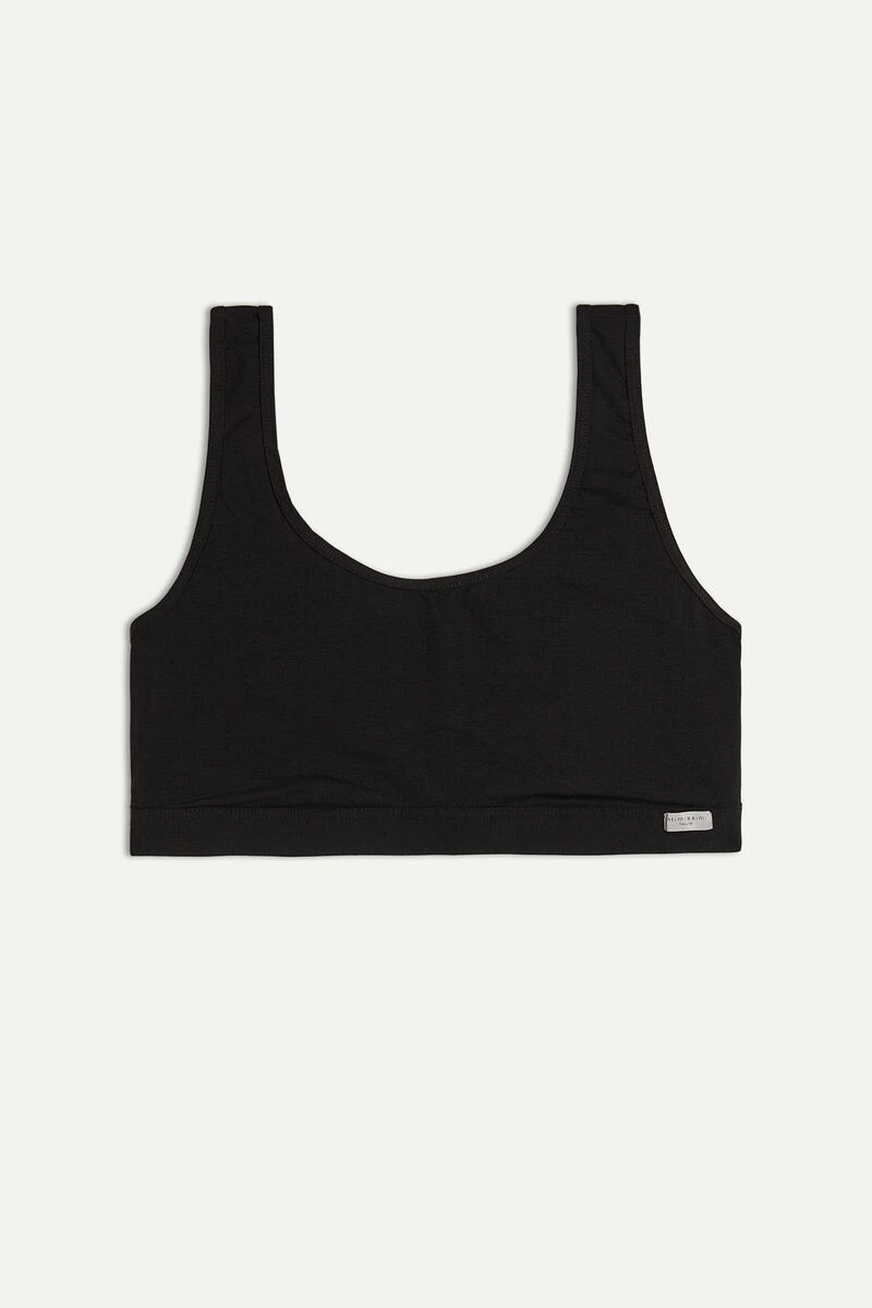 Bra top in fully lined natural cotton. Features a wide back and elasticated underband covered with cotton. No underwire and no fastening. Comfortable and convenient, it is ideal for relaxation and leisure time.