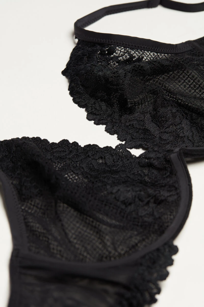 Non-padded underwired balconette bra made from two-tone lace. It features a plunging neckline and triangle-effect elongated cups. Tulle underband embellished with a lace frill. The microfibre-covered straps are adjustable at the back.