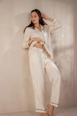 Long-sleeved modal top with front buttoning, embellished with two-tone lace frill on the hem. Contrasting trim on the cuffs. Regular fit.