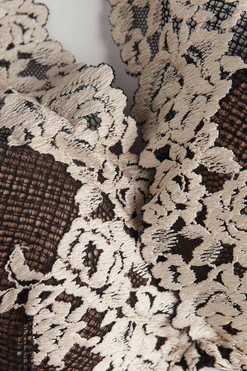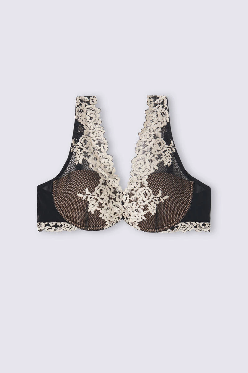 Elena balconette bra with underwire and semi-padded cups for soft support and a natural effect. Crafted from refined and elegant stretch lace with a tone-on-tone or contrasting floral pattern depending on the style. Bras in from cup size 38 (34D, except 36C and 38B) have an inner cup that covers and envelops the bust and a lace underband for extra support. The underband is also wider to adhere to and fit the body better. The shoulder straps are adjustable at the back. Ideal for wearing under plunging necklines for a feminine and sensual look.