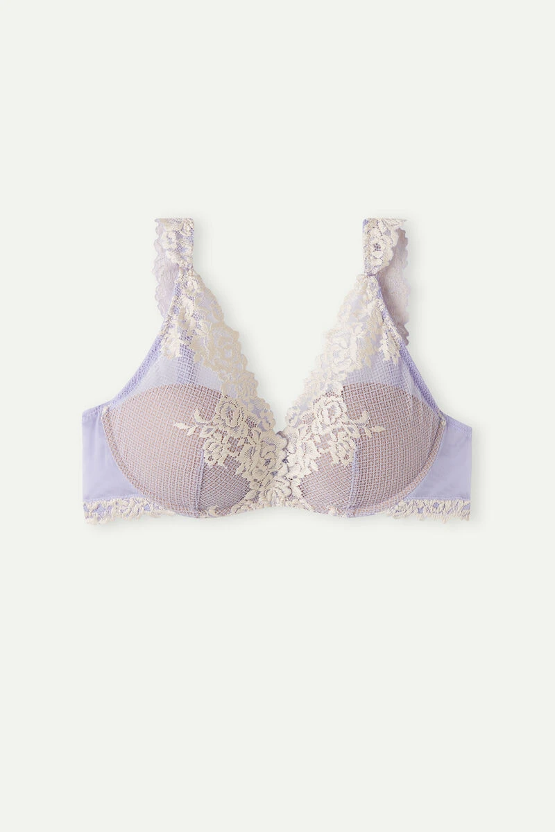 Giorgia balconette bra with underwire and graduated padded cups for added volume to create the effect of a larger size. Crafted from refined and elegant stretch lace with a tone-on-tone or contrasting floral pattern depending on the style. The scalloped deep V neckline enhances the décolletage, making the model ideal if you’re looking for a romantic yet sensual style.