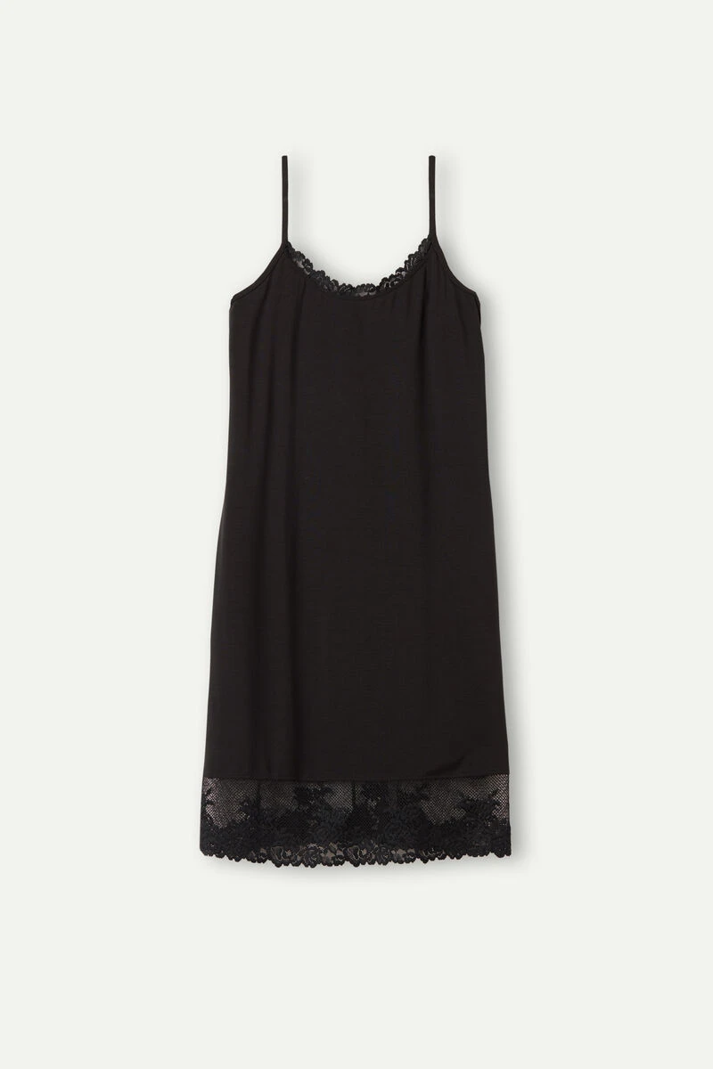 Modal slip with spaghetti straps, embellished with a lace frill on the neck and hem. Depending on the colourway selected, the lace is contrasting or tone-on-tone. It is ideal for wearing under sheer dresses or as nightwear. Close-fitting.