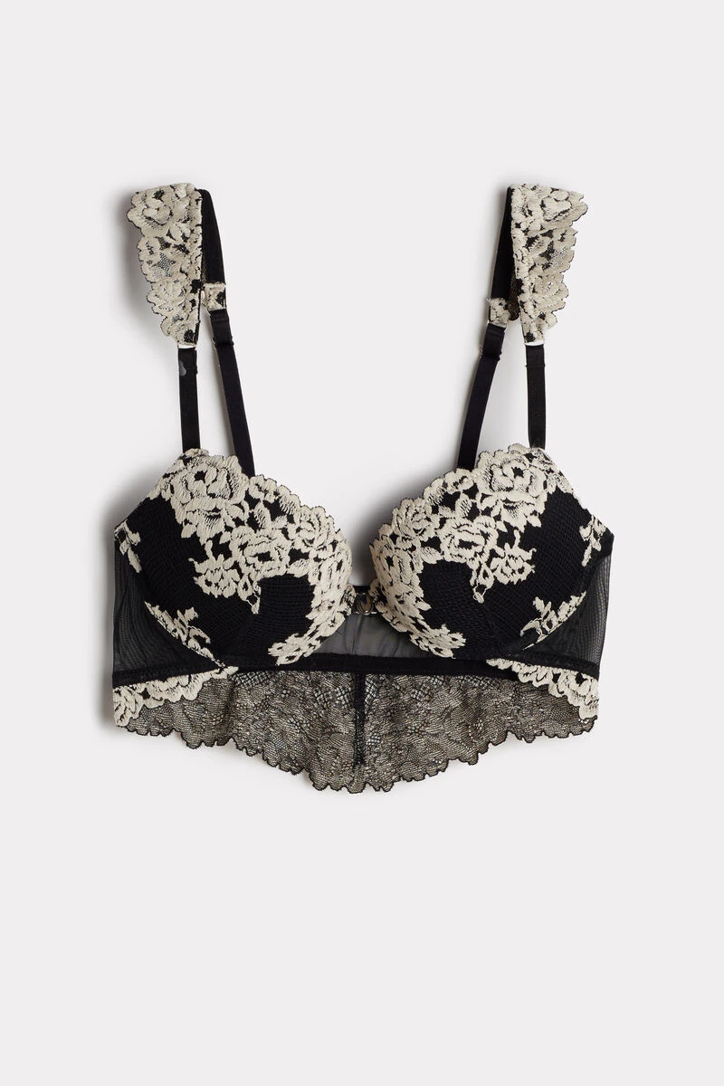 Silvia bra styled in two-tone lace with lightly graduated padding and underwire. Featuring an attractive lace embellishment on the back and a front fastening. Adjustable straps.