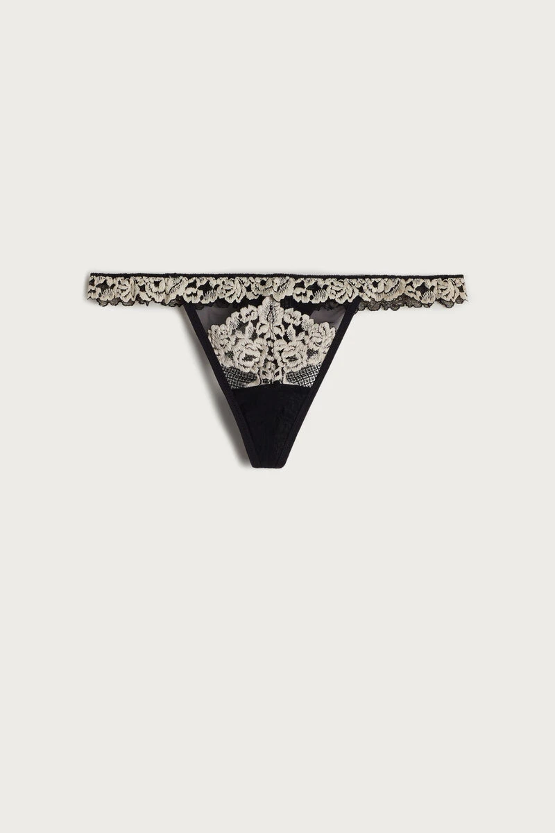 Thong with side straps crafted from lace and tulle, embellished with a lace frill. Depending on the colourway selected, the lace is contrasting or tone-on-tone. 100% cotton gusset.