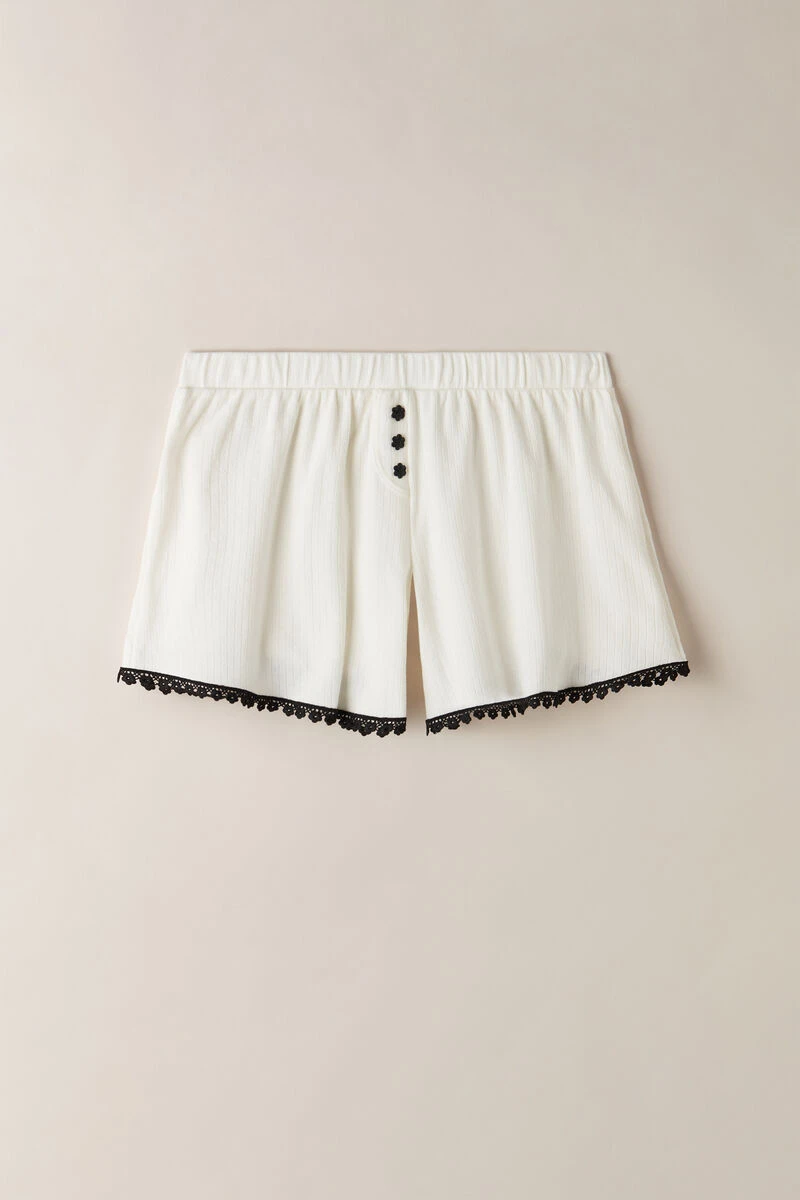Ribbed cotton shorts with openwork detail. Featuring contrasting trim and flower buttons. Regular fit.