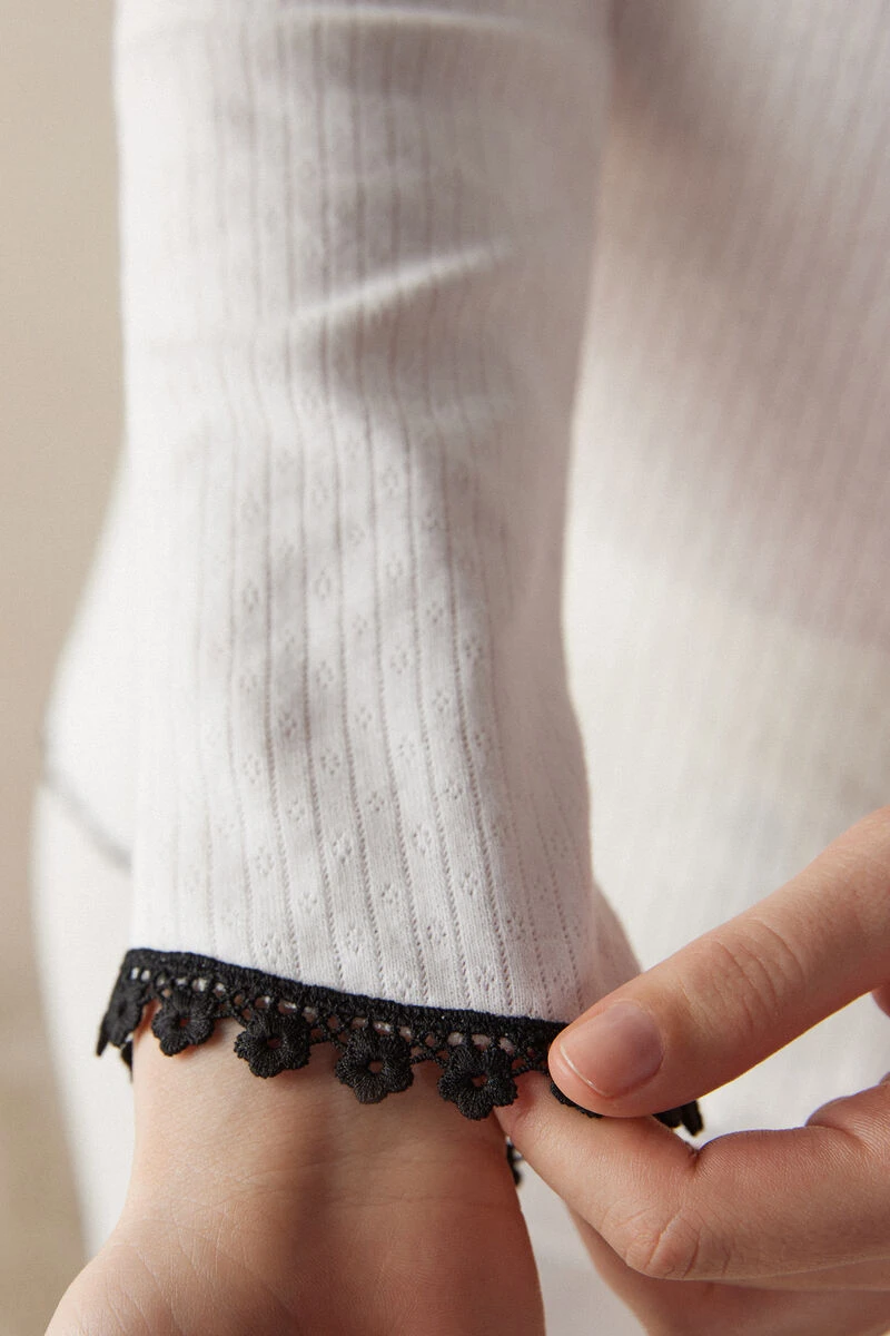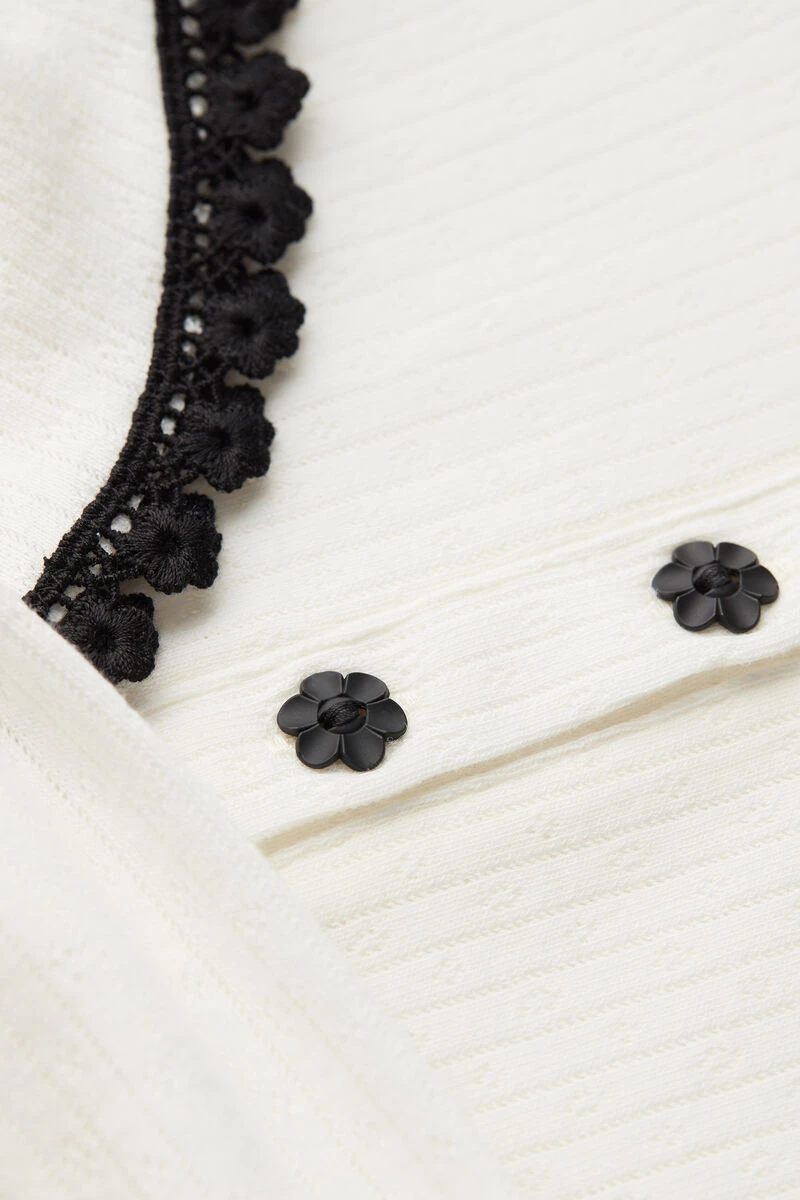Ribbed cotton grandad top with long sleeves and openwork detail. Featuring contrasting trim and flower buttons. Regular fit.