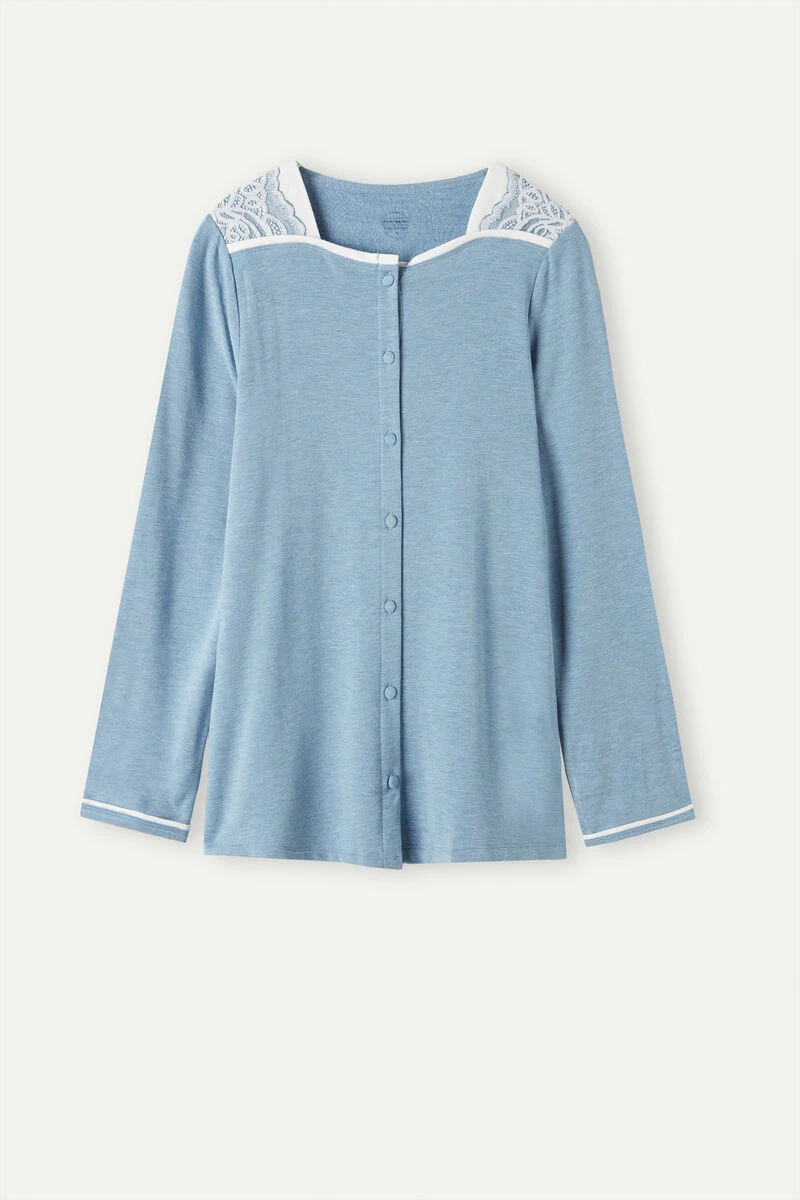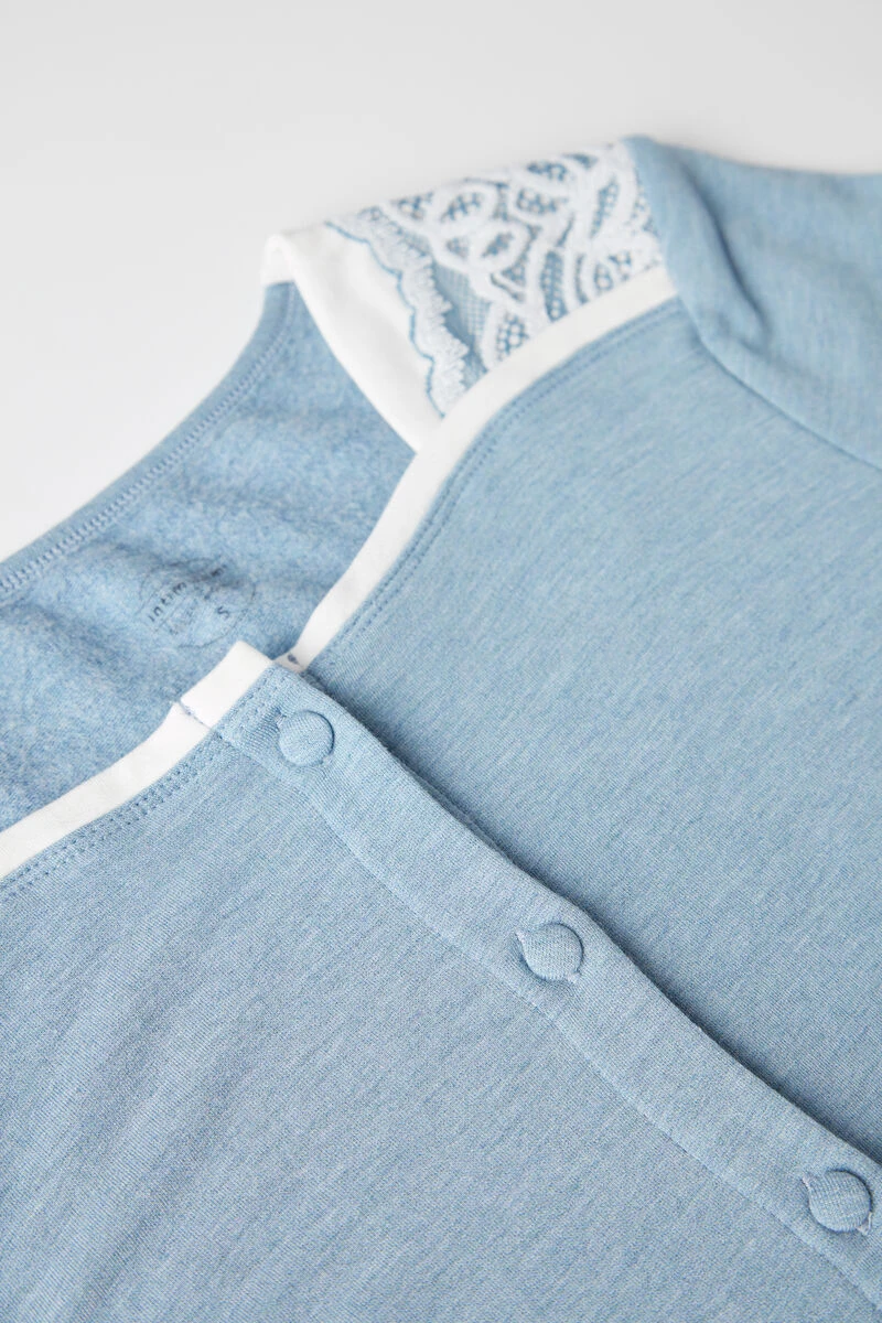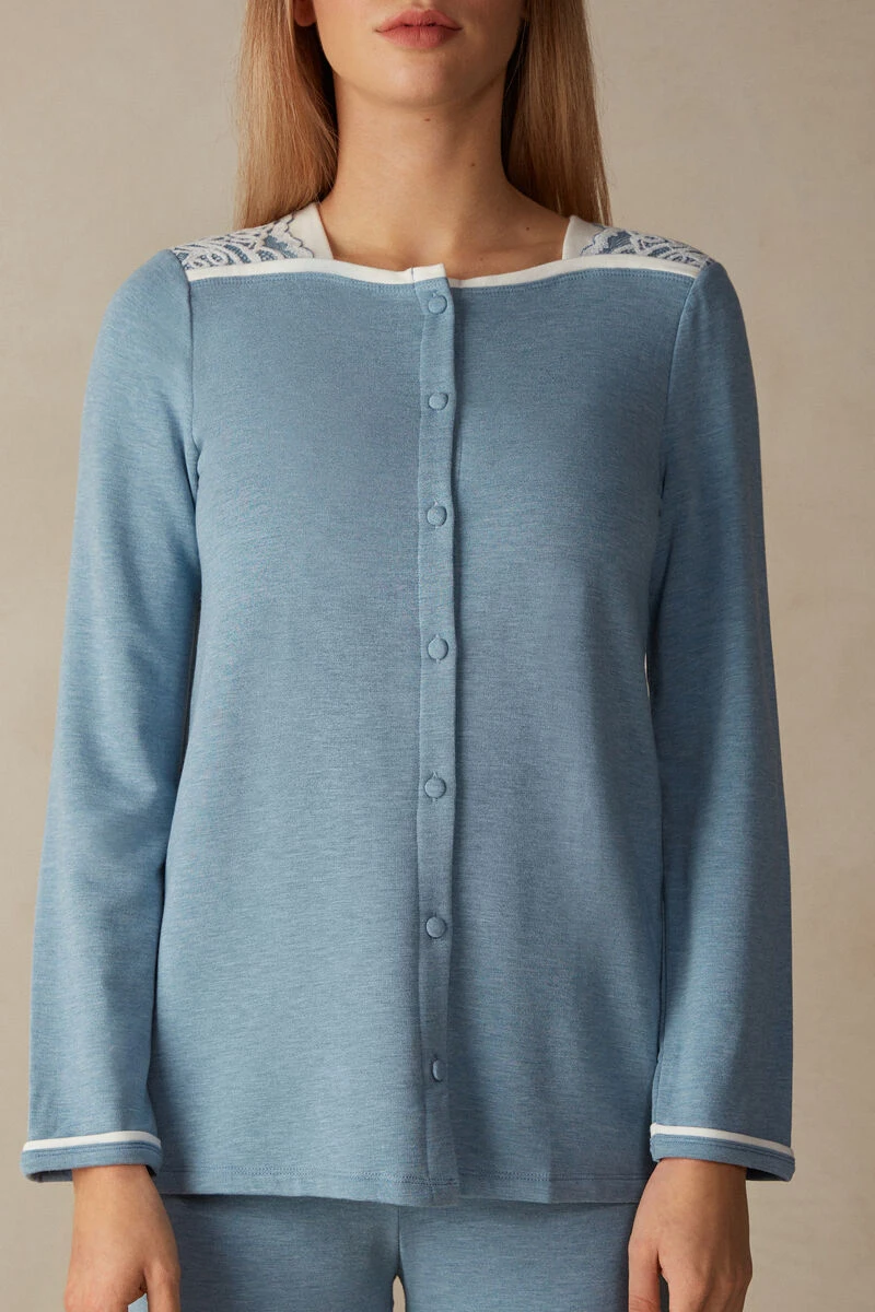 Long-sleeved button-down top with square neck. Contrasting-colour trim and romantic two-tone lace details with a chenille effect. Covered buttons. Relaxed fit.