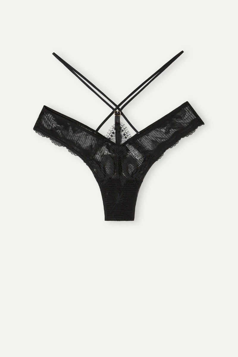 80s-style Brazilian briefs crafted in floral-patterned lace and stretch tulle. Featuring elasticated straps in a sensual design embellished with gold detail. Pure cotton gusset.
