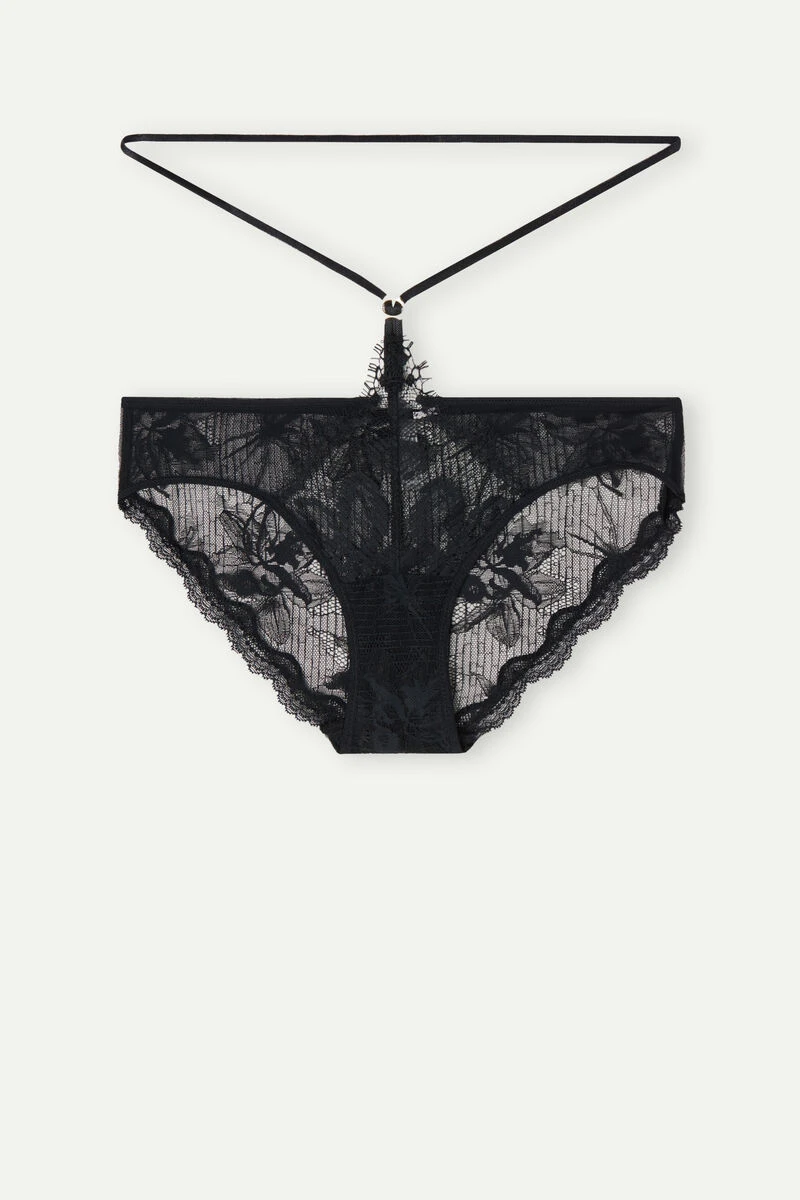 Briefs crafted in floral-patterned lace and stretch tulle. Featuring elasticated straps in a sensual design embellished with gold detail. 100% cotton gusset.