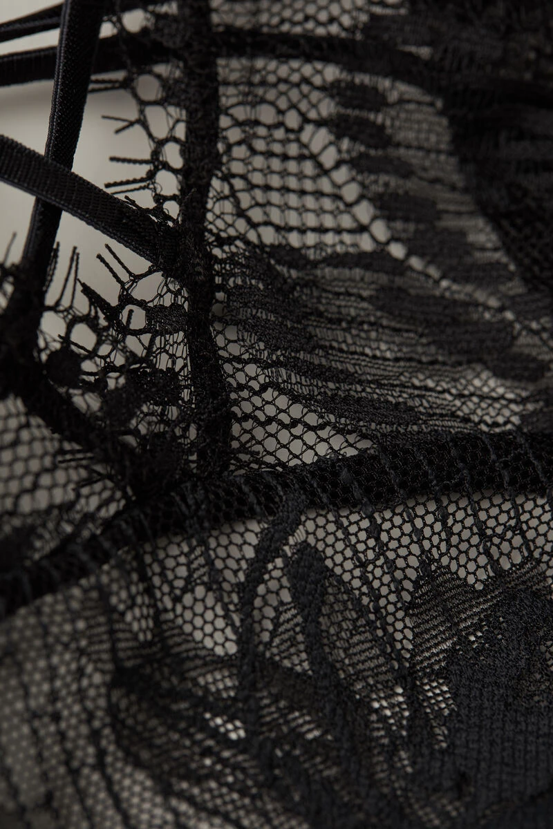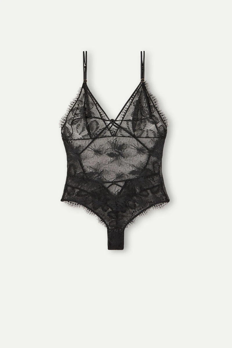 Body with triangle cups and seam under the bust. Crafted entirely in floral patterned stretch lace with a romantic and very feminine style. Featuring elasticated straps in a sensual design on the neckline and back, embellished with gold detail. High-cut leg. The double straps are adjustable at the back. 100% cotton gusset with press-stud closure.