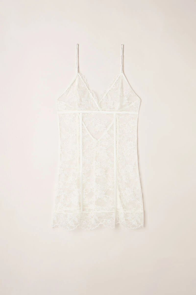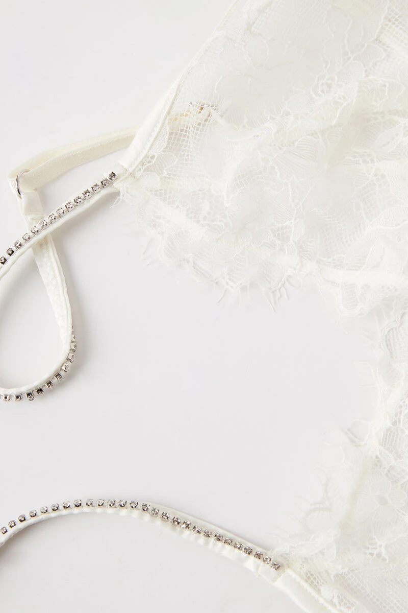 Stretch floral lace babydoll with triangle cups and underbust seam embellished with satin bands and trim. Deep V neckline on the back detailed with rhinestones. The rhinestone- and satin-covered straps are adjustable at the back.