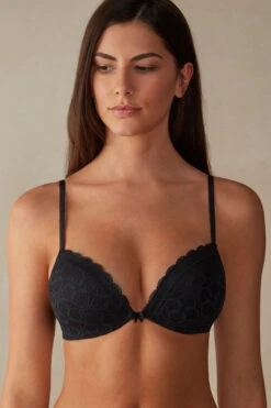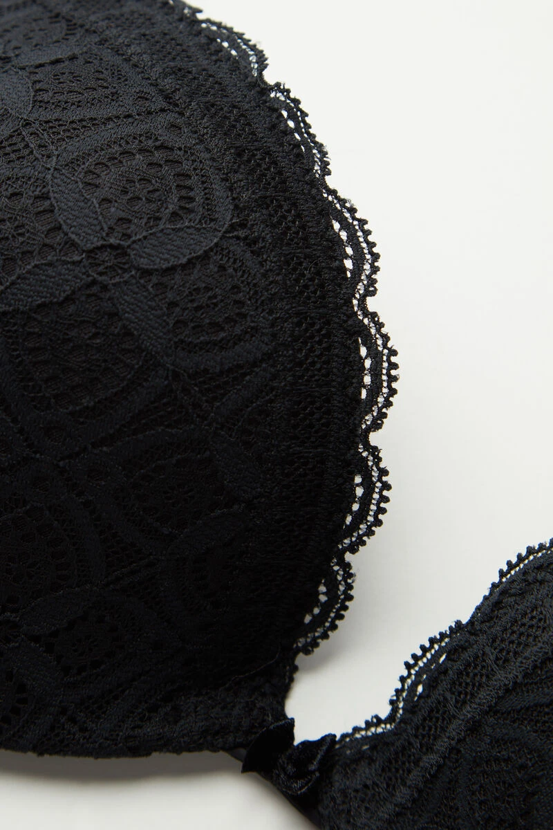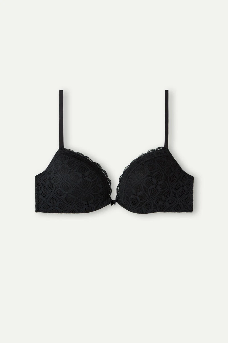 Soft stretch lace Silvia push-up bra with padded and graduated cups and no underwire. The soft padding in the cups creates a rounded finish to the bust with the effect of one size larger and the underband is double-layered in tulle for a better fit. The straps are covered in microfibre and are adjustable at the back. The lace has an on-trend, romantic allure defined by a geometric design embellished with frill. A lightweight, comfortable style that enhances the décolletage, crafted with seamless underband and cups.