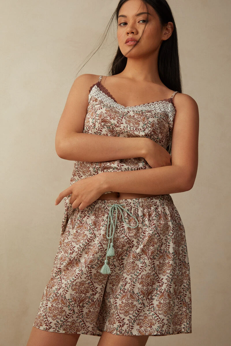 Light plain-weave cotton shorts with Indian flower print and two-tone cord drawstring finished with tassels. Midi length. Regular fit.