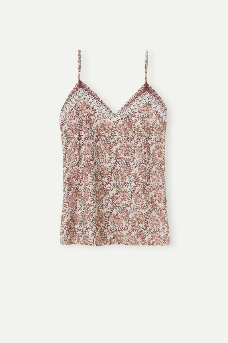 Light plain-weave cotton top with Indian flower print and V neck trimmed with soft two-tone lace. Adjustable spaghetti straps. Regular fit.