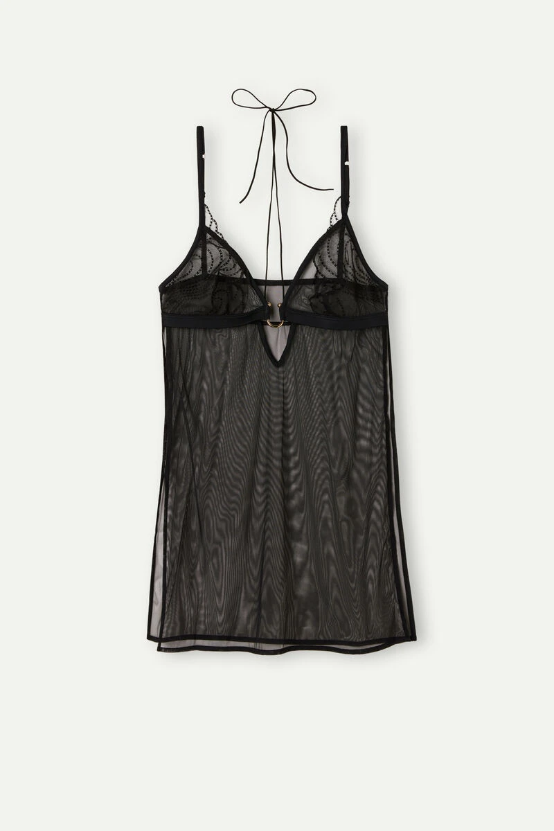 Babydoll with triangle cups, crafted from soft tulle and embellished with embroidered tulle details on the cups with elegant geometric motif. A sensual elastic cord can be tied behind the neck while the microfibre underband is embellished with a piercing-effect jewellery detail. The microfibre-covered straps are adjustable at the back.
