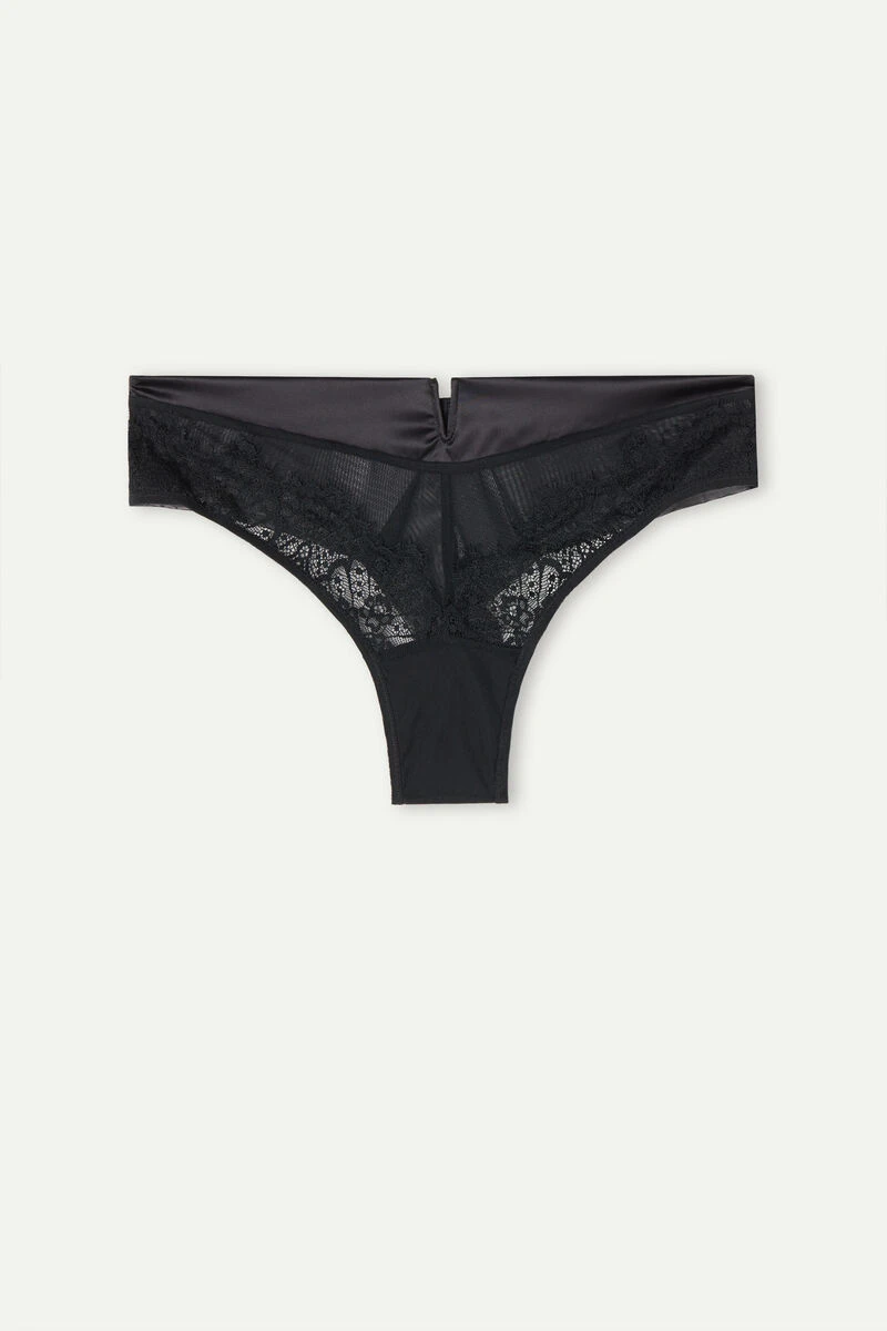 Tulle and lace Brazilian briefs. Elegant satin trim on the front with wire V detail. Seamless double-layer tulle back. 100% cotton gusset.