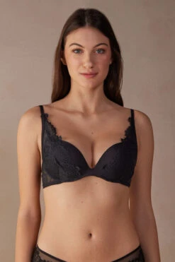 Wireless Gioia super push-up bra with heavily padded graduated moulded cups. Crafted from elegant and refined lace and tulle, and trimmed with satin. The satin-covered straps can be adjusted at the back. The ideal style to create a voluminous finish with the effect of a bust two sizes larger and a striking décolletage.
