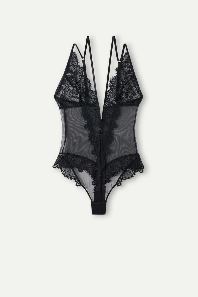 Lace and tulle body with triangle cups. Features a plunging neckline with wire V detail and satin trim embellishing the décolletage. The elasticated straps are adjustable at the back. High-cut leg. 100% cotton gusset with press stud closure.