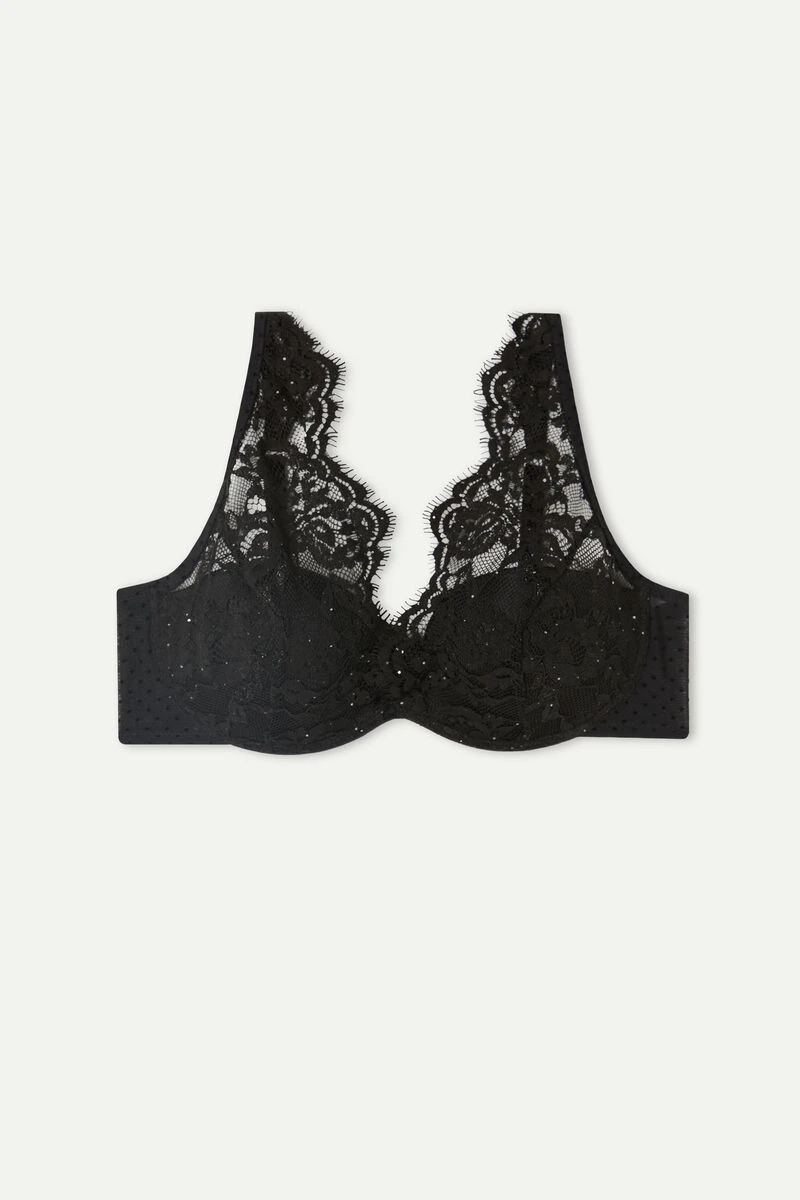 Elena balconette bra with underwire and semi-padded cups for soft support and a natural effect. The style is crafted from lace embellished with micro sequins to create an elegant and refined sparkling effect. The underband and trim are made from flocked stretch tulle. Elegant and adjustable velvet-effect elasticated straps. Romantic and feminine.