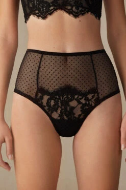 Soft flocked tulle French knickers detailed with micro-sequin embellished lace. Elegant velvet-effect elasticated waistband. 100% cotton gusset.