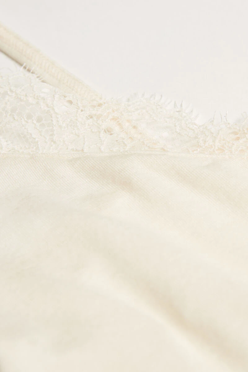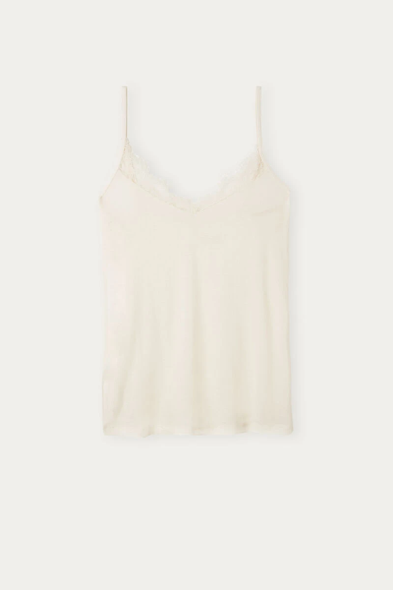 Ultralight modal and cashmere camisole with V neck embellished with a romantic lace frill. Elasticated spaghetti straps. Gently envelops the body.