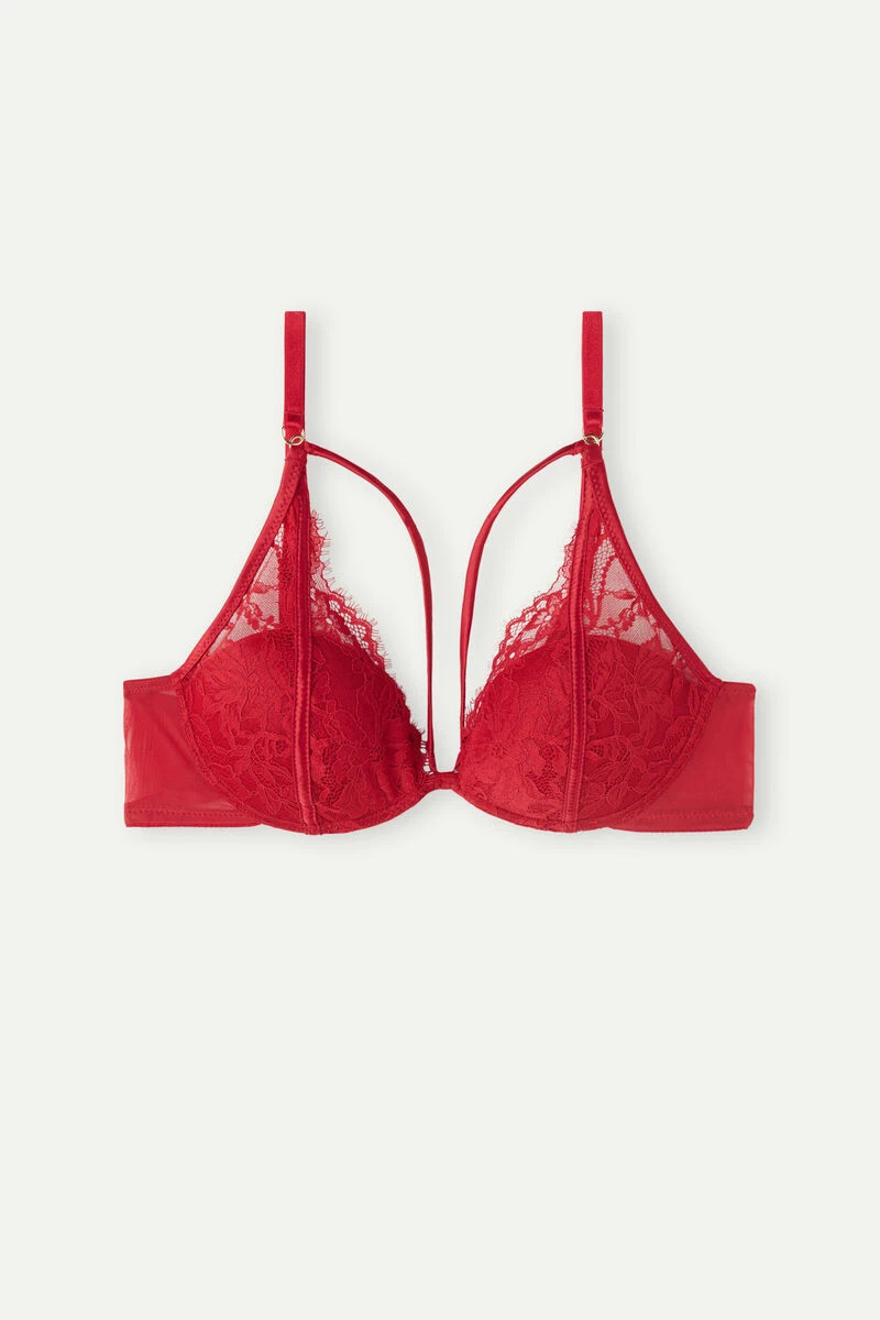 Elena balconette bra with underwire and semi-padded cups for soft support and a natural effect. Crafted from soft stretch lace with a floral design and finished with satin details and trim on the cups. The straps are embellished with gold-finish eyelets with a jewel effect. The stretch straps are adjustable at the back. An alluring and sensual style.