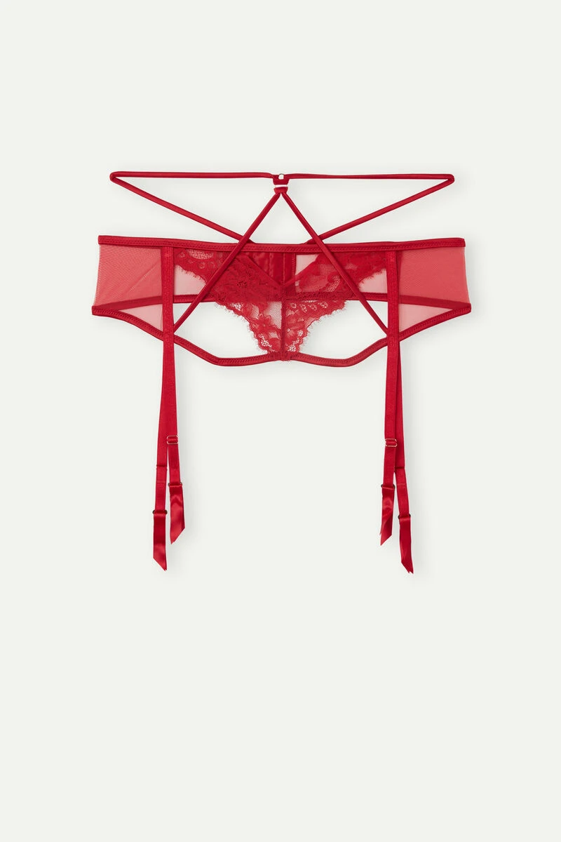Stretch lace and tulle suspenders with alluring and sensual satin details, to be worn at the waist. Embellished with gold-finish eyelets with a jewel effect.