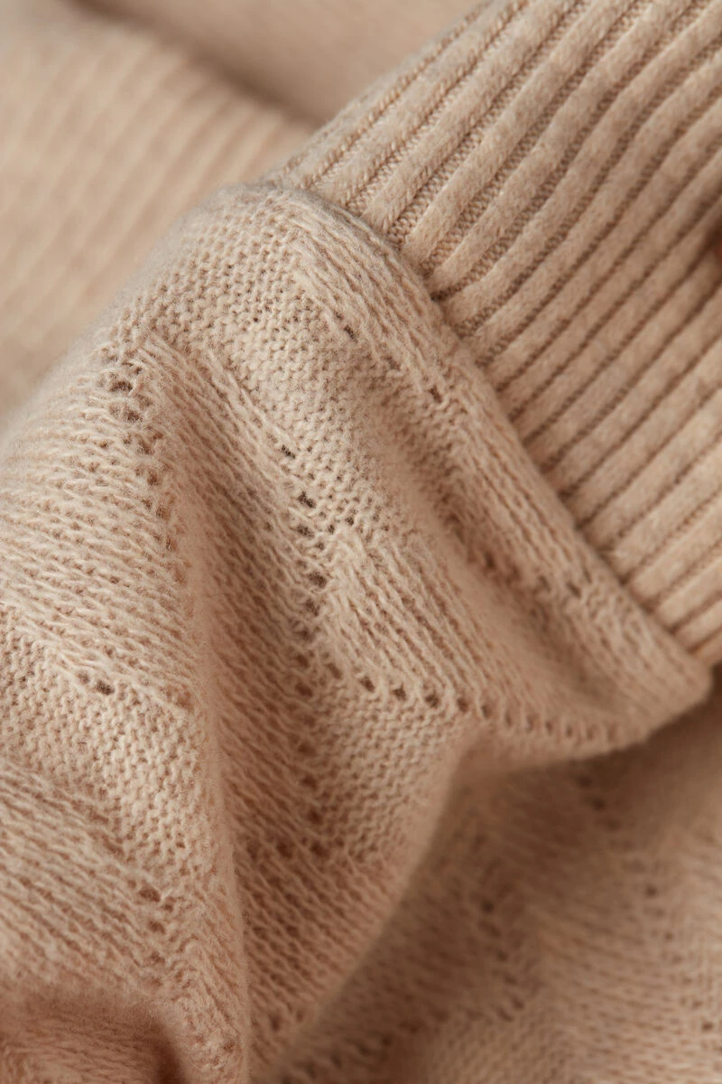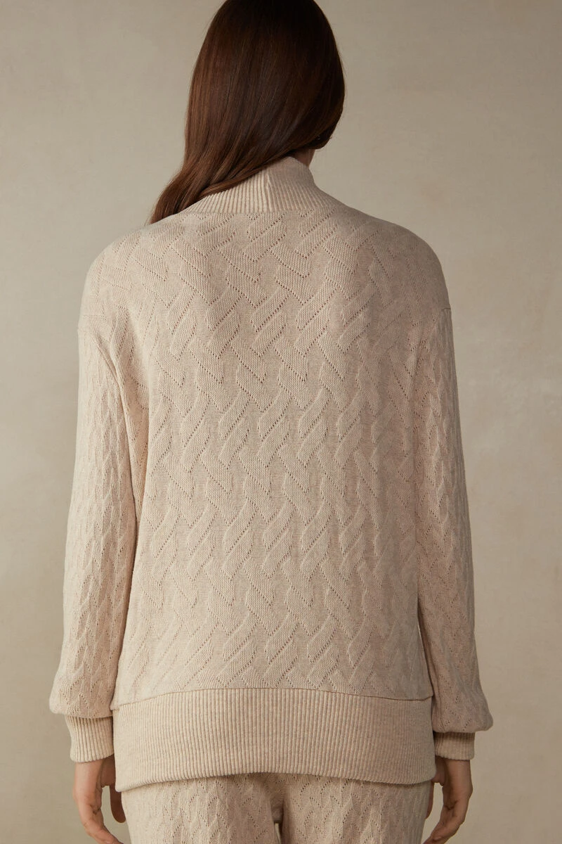 Long-sleeved cardigan with shawl collar, crafted from cable-knit tricot-effect fabric. Wide ribbed trims and horn-effect buttons. Oversized fit.